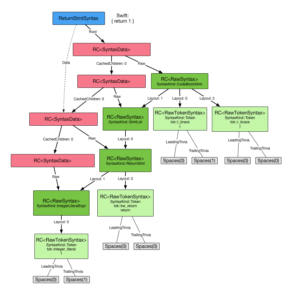 它用一些附加信息包装RawSyntax节点:指向父节点的指针,该节点在其父节点中的位置以及缓存的子节点。可以将SyntaxData视为“具体“或“已实现”语法节点。它们代表特定的源代码片段,具有绝对的位置,行和列号等。SyntaxData是每个Syntax节点的基础存储,私有的,不对外暴露。